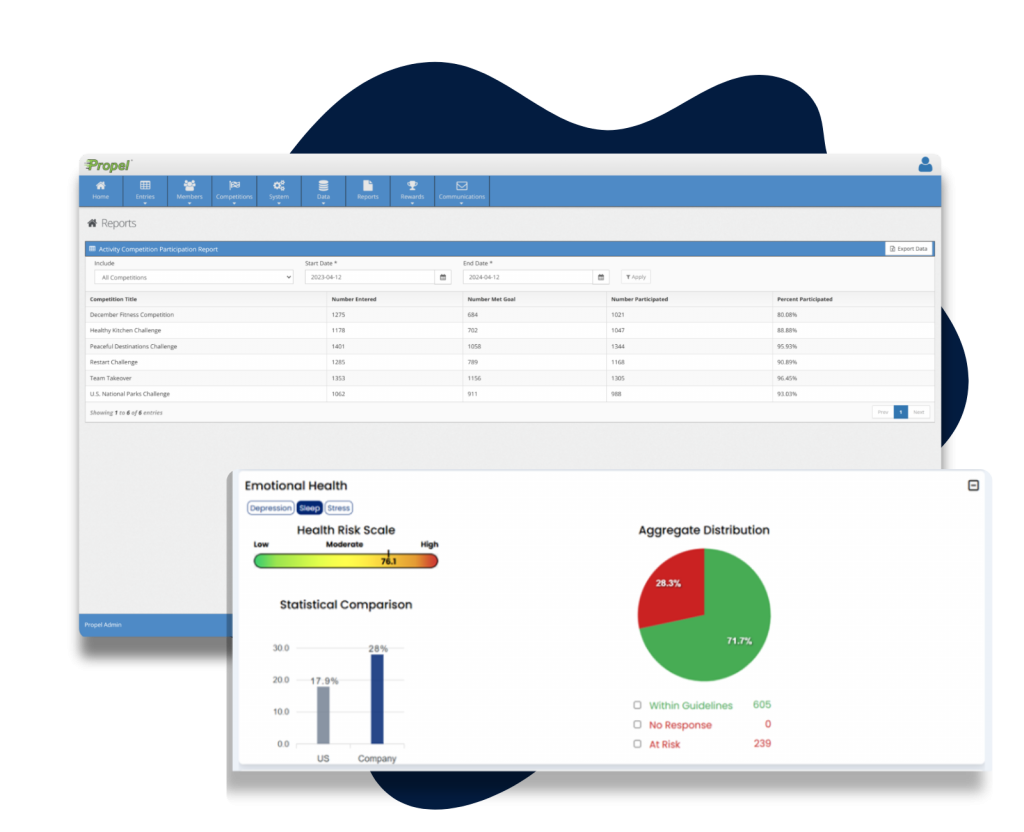 Propel gives administrators access to real-time engagement reporting on membership, challenge participation and engagement, incentive program progress, self-paced education progress, incentive progress reports and more.